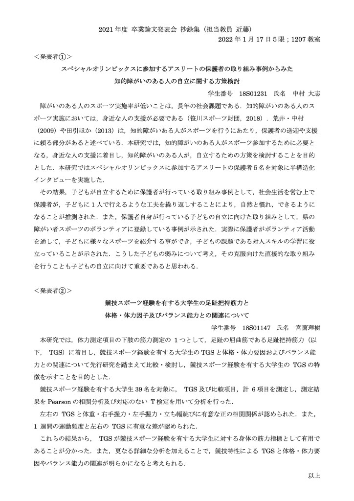 2022年1月17日(月)に2021年度 卒業論文発表会を実施致しました。当日は、布袋屋先生クラスとの合同で実施致しました。近藤クラスからは2名の発表を行いました。1年間かけて取り組んできた成果を発表することができました。下記は発表抄録です。