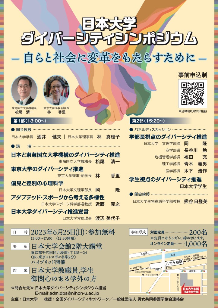 研究、連絡 投稿者: kondokatsuyuki2023年6月9日2:10 午前2023年6月9日 日本大学ダイバーシティシンポジウムのご案内 この度、大変貴重な機会に参加させていただくこととなりました。参加は無料です。多くの皆様のご参加をお待ちしております。 日本大学ダイバーシティ推進宣言はこちらからご覧ください。 事前申込制となっております。こちらからGoogle フォームにアクセスできます。申し込み期限は、6月23日(金)です。 下記チラシのPDF版はこちらからご覧ください。 共有: クリックして X で共有 (新しいウィンドウで開きます) X Facebook で共有するにはクリックしてください (新しいウィンドウで開きます) Facebook いいね 読み込み中… 関連