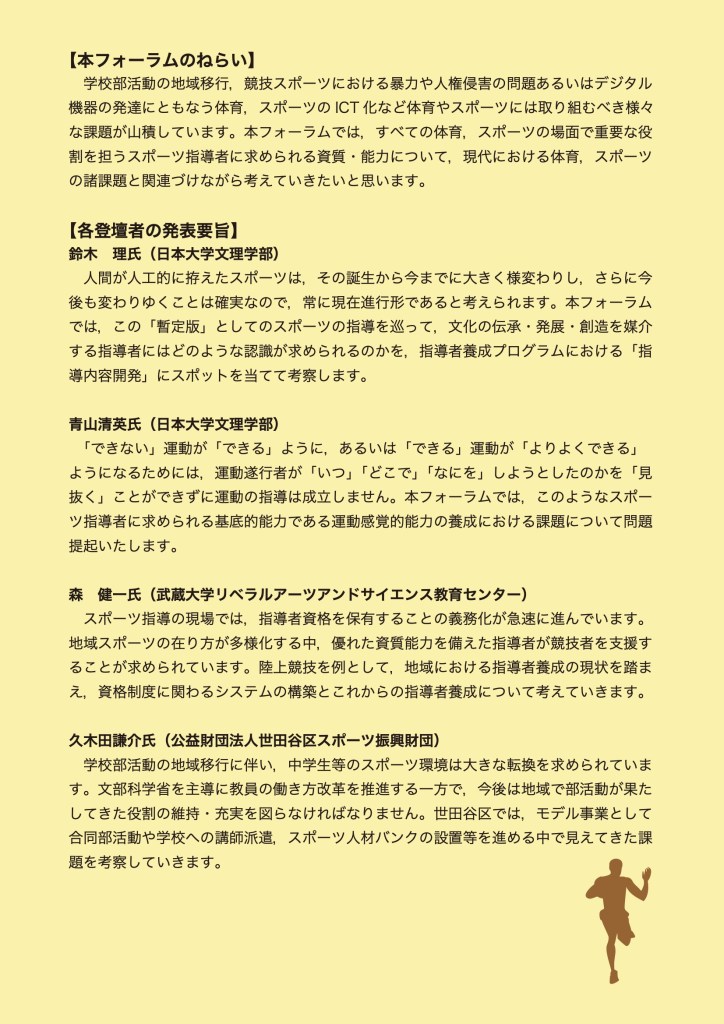 2024年6月8日(土)に開催された、日本大学学術助成金研究課題(研究代表者:文理学部体育学科 青山清英教授)「大学地域連携研究の学問的基盤と人材育成に関する研究 ースポーツ教育事業の検討からー」におけるフォーラムへ参加いたしました。