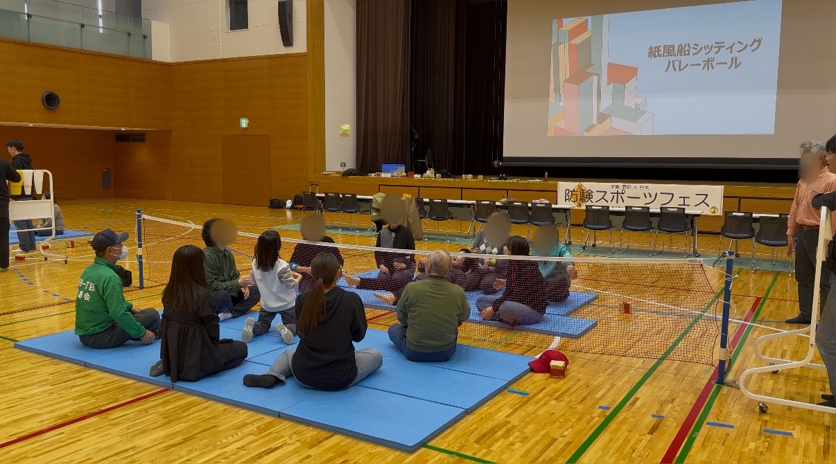 私たちは、地域の皆さんが年齢などに関わらず参加できるスポーツとして「紙風船シッティングバレーボール」を提案しました。紙風船は、参加者の皆さん自身で作成していただきました。6チームに分かれて実施し、大いに盛り上がりました!参加者の皆さん、ありがとうございました!
